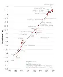 La loi de Koomey décrit une tendance à long terme dans l'histoire des ordinateurs, selon laquelle le nombre de calculs par joule (unité d'énergie) dépensé double tous les 18 mois environ. Il s'avère que cette tendance a été remarquablement stable depuis les années 1950, le nombre de calculs par joule dépensé ayant doublé environ tous les 1,57 ans. Cette loi énoncée par Jonathan Koomey aurait été énoncée comme suit : la quantité d'énergie dont une machine a besoin pour effectuer un nombre donné de calculs va diminuer d'un facteur deux chaque année et demi[1],[2].