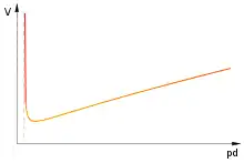 où et sont des constantes caractéristiques des électrodes et du gaz et où est la pression de celui-ci. Les courbes donnant les représentations graphiques de en fonction du produit sont appelées courbes de Paschen.