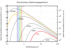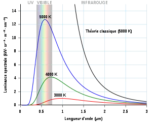 La courbe pour 3 000 K correspond au rayonnement typique d'une lampe à incandescence. Une partie du rayonnement est émis dans le domaine visible. Toutefois le maximum d'émission se situe encore dans l'infrarouge proche.