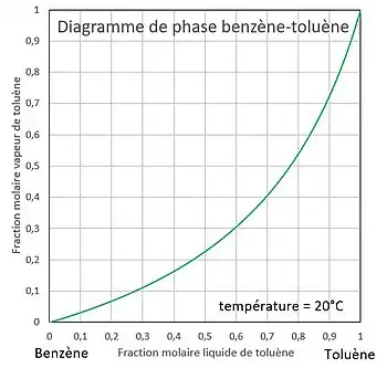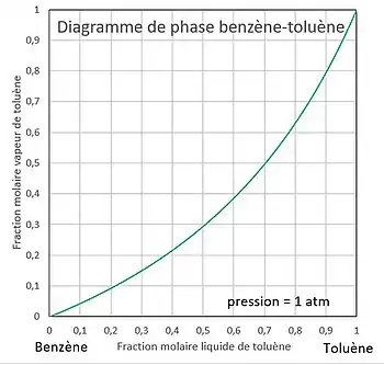 La pression d'ébullition est calculée par (voir le paragraphe Diagrammes de phase binaires idéaux) :
