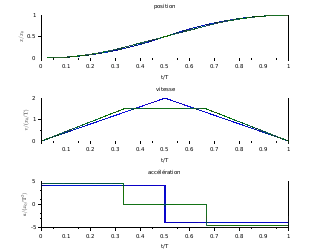Les conditions initiales et finales imposent six conditions : x(0) = 0, v(0) = 0, a(0) = 0, x(T) = xf, v(T) = 0, a(T) = 0. La fonction x(T) est donc au minimum d'un polynôme de degré cinq :