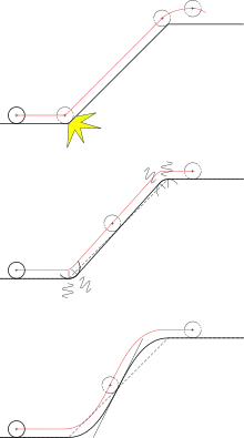 Une première solution consisterait à raccorder les segments de droite par des arcs de cercle dont le rayon est supérieur à celui du galet (figure du milieu). Si le système ne subit plus de choc, en revanche il subit des à-coups important en entrée et en sortie des raccordements circulaires. Par exemple à l'entrée du premier raccord, l'accélération verticale est nulle à gauche ; à droite, le galet est sur une trajectoire circulaire avec une vitesse circonférentielle vh, il subit donc une accélération radiale vh2/R. L'accélération passe donc instantanément de 0 à une valeur non-nulle. Autre manière de voir, c'est comme si le conducteur d'une voiture, pour aborder un virage, tournait brusquement le volant pour passer instantanément d'une trajectoire en ligne droite à un virage de rayon donné.