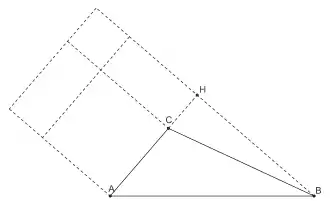 La démonstration d'Euclide[6] par la proposition 12 (angle obtus) et 13 (angle aigu) s'appuie sur le théorème de Pythagore et fait intervenir le point H pied de la hauteur issue de B. Pour Euclide cette propriété est une propriété sur des aires. Pour l'angle obtus (proposition 12), Euclide construit le carré extérieur au triangle AHB de côté [AH] et remarque que