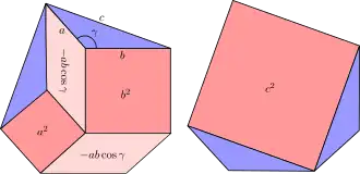- en rose, les aires a2, b2 et –2ab cos γ à gauche, et l'aire c2 à droite ;