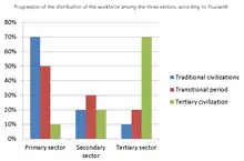 La répartition des effectifs entre les trois secteurs progresse à travers les différentes étapes, comme suit, selon Fourastié.