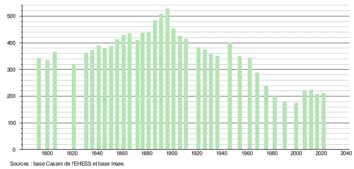 L'évolution du nombre d'habitants est connue à travers les recensements de la population effectués dans la commune depuis 1793. Pour les communes de moins de 10 000 habitants, une enquête de recensement portant sur toute la population est réalisée tous les cinq ans, les populations légales des années intermédiaires étant quant à elles estimées par interpolation ou extrapolation[24]. Pour la commune, le premier recensement exhaustif entrant dans le cadre du nouveau dispositif a été réalisé en 2006[25].