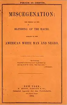 Le terme métissage (miscegenation en anglais) a été utilisé pour la première fois en 1863, pendant la Guerre de Sécession, par des journalistes dans une publication canular pour discréditer le mouvement abolitionniste en attisant le débat sur la perspective d'un mariage interracial après l'abolition de l'esclavage[1].