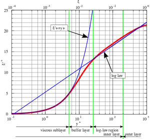 - d'une région de turbulence développée caractérisée par la loi logarithmique et dont le sommet est assez mal défini : , étant l'épaisseur de couche limite. Ce sommet définit une « échelle intégrale » de la couche limite ;