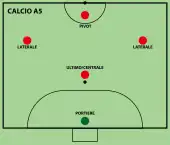 Un terrain de futsal mesure environ 40m de long sur 20m de large[7],[8], équivalent au terrain de handball[9],[10]. La longueur doit être au minimum de 25 mètres (38 mètres pour les matchs internationaux) et ne doit pas excéder 42 mètres[11],[12]. La largeur, quant à elle, doit être au minimum de 15 mètres (18 mètres pour les matches internationaux) et ne doit pas excéder 25 mètres[11],[12].