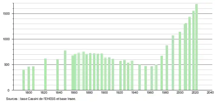L'évolution du nombre d'habitants est connue à travers les recensements de la population effectués dans la commune depuis 1793. Pour les communes de moins de 10 000 habitants, une enquête de recensement portant sur toute la population est réalisée tous les cinq ans, les populations légales des années intermédiaires étant quant à elles estimées par interpolation ou extrapolation[18]. Pour la commune, le premier recensement exhaustif entrant dans le cadre du nouveau dispositif a été réalisé en 2007[19].