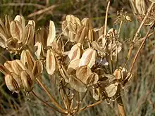 Les fruits sont blongs à elliptiques, de 7 à 28 mm de long, glabres, possédant des ailes étroites à assez larges[1]. Il y a un tube à huile (vittae) solitaire dans chaque intervalle (vallécule)[2].