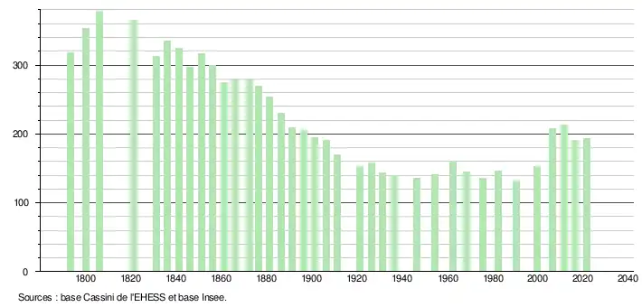 L'évolution du nombre d'habitants est connue à travers les recensements de la population effectués dans la commune depuis 1793. Pour les communes de moins de 10 000 habitants, une enquête de recensement portant sur toute la population est réalisée tous les cinq ans, les populations légales des années intermédiaires étant quant à elles estimées par interpolation ou extrapolation[17]. Pour la commune, le premier recensement exhaustif entrant dans le cadre du nouveau dispositif a été réalisé en 2006[18].