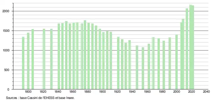 | L'évolution du nombre d'habitants est connue à travers les recensements de la population effectués dans la commune depuis 1793. Pour les communes de moins de 10 000 habitants, une enquête de recensement portant sur toute la population est réalisée tous les cinq ans, les populations légales des années intermédiaires étant quant à elles estimées par interpolation ou extrapolation[32]. Pour la commune, le premier recensement exhaustif entrant dans le cadre du nouveau dispositif a été réalisé en 2008[33]. En 2021, la commune comptait 2 143 habitants[Note 4], en augmentation de 2,49 % par rapport à 2015 (Gers : +0,79 %, France hors Mayotte : +1,84 %). |