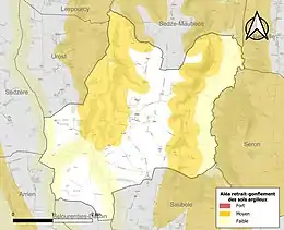 Le retrait-gonflement des sols argileux est susceptible d'engendrer des dommages importants aux bâtiments en cas d’alternance de périodes de sécheresse et de pluie[28]. 42 % de la superficie communale est en aléa moyen ou fort (59 % au niveau départemental et 48,5 % au niveau national)[Carte 4]. Depuis le , en application de la loi ELAN, différentes contraintes s'imposent aux vendeurs, maîtres d'ouvrages ou constructeurs de biens situés dans une zone classée en aléa moyen ou fort[Note 6],[29].