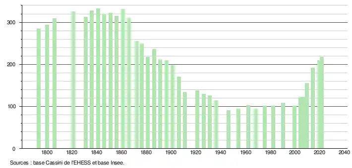 L'évolution du nombre d'habitants est connue à travers les recensements de la population effectués dans la commune depuis 1793. Pour les communes de moins de 10 000 habitants, une enquête de recensement portant sur toute la population est réalisée tous les cinq ans, les populations légales des années intermédiaires étant quant à elles estimées par interpolation ou extrapolation[36]. Pour la commune, le premier recensement exhaustif entrant dans le cadre du nouveau dispositif a été réalisé en 2004[37].