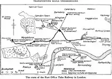 En 1911, un plan a été élaboré pour construire un chemin de fer souterrain de 6,5 milles (10,5 km) de long[2] de Paddington à Whitechapel desservant les principaux centres de tri le long du parcours ; la congestion du trafic routier provoquait des retards inacceptables. Le contrat de construction des tunnels a été remporté par John Mowlem and Co[3]. La construction des tunnels a commencé en février 1915 à partir d'une série de puits. La plus grande partie de la ligne a été construite en utilisant le système de tunnelier Greathead, avec peu de minage manuelles pour les tunnels de connexion aux stations.