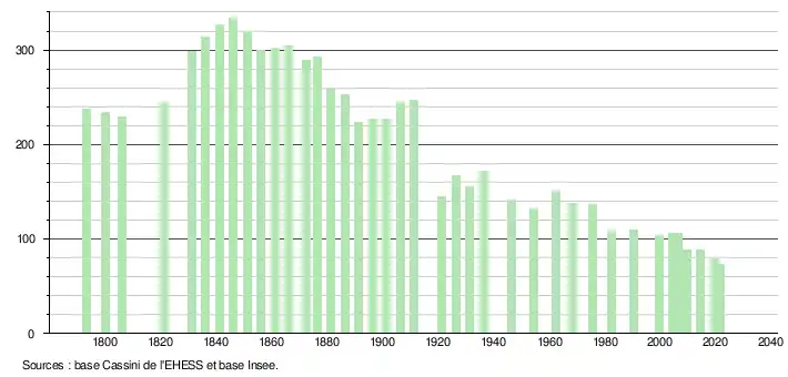 L'évolution du nombre d'habitants est connue à travers les recensements de la population effectués dans la commune depuis 1793. Pour les communes de moins de 10 000 habitants, une enquête de recensement portant sur toute la population est réalisée tous les cinq ans, les populations légales des années intermédiaires étant quant à elles estimées par interpolation ou extrapolation[19]. Pour la commune, le premier recensement exhaustif entrant dans le cadre du nouveau dispositif a été réalisé en 2004[20].