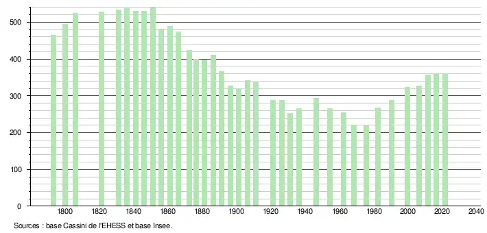 L'évolution du nombre d'habitants est connue à travers les recensements de la population effectués dans la commune depuis 1793. Pour les communes de moins de 10 000 habitants, une enquête de recensement portant sur toute la population est réalisée tous les cinq ans, les populations légales des années intermédiaires étant quant à elles estimées par interpolation ou extrapolation[21]. Pour la commune, le premier recensement exhaustif entrant dans le cadre du nouveau dispositif a été réalisé en 2006[22].