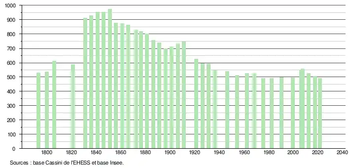 L'évolution du nombre d'habitants est connue à travers les recensements de la population effectués dans la commune depuis 1793. Pour les communes de moins de 10 000 habitants, une enquête de recensement portant sur toute la population est réalisée tous les cinq ans, les populations légales des années intermédiaires étant quant à elles estimées par interpolation ou extrapolation[18]. Pour la commune, le premier recensement exhaustif entrant dans le cadre du nouveau dispositif a été réalisé en 2007[19].