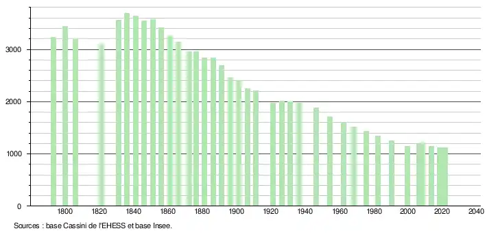 L'évolution du nombre d'habitants est connue à travers les recensements de la population effectués dans la commune depuis 1793. Pour les communes de moins de 10 000 habitants, une enquête de recensement portant sur toute la population est réalisée tous les cinq ans, les populations légales des années intermédiaires étant quant à elles estimées par interpolation ou extrapolation[33]. Pour la commune, le premier recensement exhaustif entrant dans le cadre du nouveau dispositif a été réalisé en 2008[34].