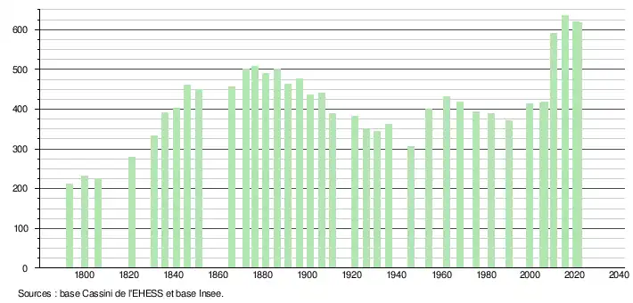 L'évolution du nombre d'habitants est connue à travers les recensements de la population effectués dans la commune depuis 1793. Pour les communes de moins de 10 000 habitants, une enquête de recensement portant sur toute la population est réalisée tous les cinq ans, les populations légales des années intermédiaires étant quant à elles estimées par interpolation ou extrapolation[19]. Pour la commune, le premier recensement exhaustif entrant dans le cadre du nouveau dispositif a été réalisé en 2005[20].