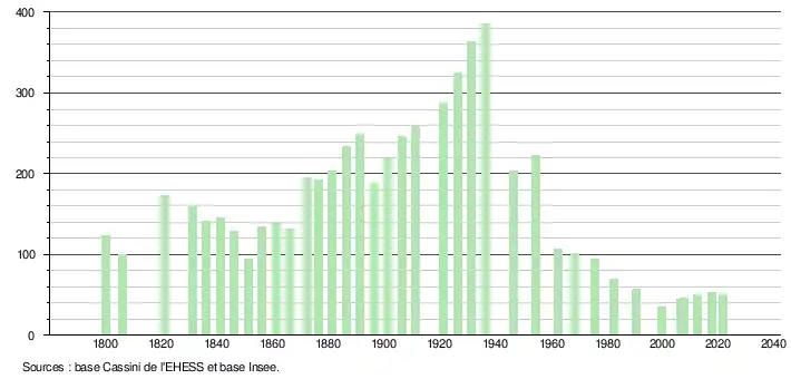 L'évolution du nombre d'habitants est connue à travers les recensements de la population effectués dans la commune depuis 1800. Pour les communes de moins de 10 000 habitants, une enquête de recensement portant sur toute la population est réalisée tous les cinq ans, les populations légales des années intermédiaires étant quant à elles estimées par interpolation ou extrapolation[8]. Pour la commune, le premier recensement exhaustif entrant dans le cadre du nouveau dispositif a été réalisé en 2007[9].