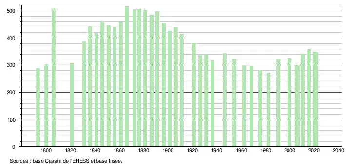 L'évolution du nombre d'habitants est connue à travers les recensements de la population effectués dans la commune depuis 1793. Pour les communes de moins de 10 000 habitants, une enquête de recensement portant sur toute la population est réalisée tous les cinq ans, les populations légales des années intermédiaires étant quant à elles estimées par interpolation ou extrapolation[26]. Pour la commune, le premier recensement exhaustif entrant dans le cadre du nouveau dispositif a été réalisé en 2005[27].