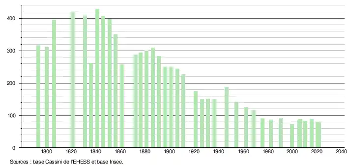 L'évolution du nombre d'habitants est connue à travers les recensements de la population effectués dans la commune depuis 1793. Pour les communes de moins de 10 000 habitants, une enquête de recensement portant sur toute la population est réalisée tous les cinq ans, les populations légales des années intermédiaires étant quant à elles estimées par interpolation ou extrapolation[17]. Pour la commune, le premier recensement exhaustif entrant dans le cadre du nouveau dispositif a été réalisé en 2005[18].