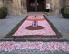 Tapis de fleurs devant l'église de Losar de la Vera à l'occasion de la Fête-Dieu, juin 2010