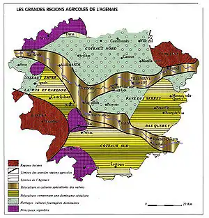 Malgré un certain nombre de nuances, on observe nombre de similitudes dans les conditions de production des collines et coteaux de Lot-et-Garonne. Les terres y sont concentrées dans les mains de quelques paysans : les unités y dépassent fréquemment 50 ha et la dimension s'accroît au fur et à mesure que l'on s'éloigne des vallées. La situation à l'écart des grandes infrastructures de transport influence les types de cultures possibles dans les coteaux et les collines et, par suite, la quantité de terre nécessaire à un ménage agricole pour vivre sur l'exploitation. Élevage et cultures fourragères sont les principales activités agricoles des coteaux situés au nord de la vallée de la Garonne et du Lot. Les surfaces toujours en herbe y sont très répandues, occupant 30 % de la SAU et donnant lieu à une exploitation sous forme de foin, complétée par des fourrages où l'orge occupe une place prépondérante. Ceci explique l'existence d'un important troupeau de bovins, environ 45 % de l'effectif départemental, part qui est encore en accroissement. Entre le Lot et la Garonne, dans les Serres de l’Agenais, on retrouve le même dualisme : céréaliculture traditionnelle, oléagineux, fourrages, prairies naturelles et terrains de parcours pour le bétail, l'élevage prenant parfois un caractère extensif. Au sud de la Garonne, le Néracais est marqué par l'association céréaliculture et oléagineux, le tournesol progressant le plus. Les cultures légumières existent dans les communes les plus proches d’Agen. La vigne se maintient à proximité de la coopérative viticole de Buzet, mais aussi en allant vers le Condomois (armagnac). Enfin entre Casteljaloux et Marmande règne la polyculture associant céréales (place importante donné au maïs), cultures spécialisées et élevage.