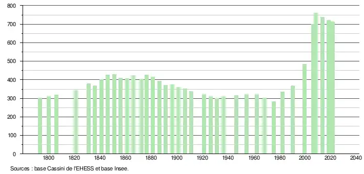 L'évolution du nombre d'habitants est connue à travers les recensements de la population effectués dans la commune depuis 1793. Pour les communes de moins de 10 000 habitants, une enquête de recensement portant sur toute la population est réalisée tous les cinq ans, les populations légales des années intermédiaires étant quant à elles estimées par interpolation ou extrapolation[21]. Pour la commune, le premier recensement exhaustif entrant dans le cadre du nouveau dispositif a été réalisé en 2008[22].
