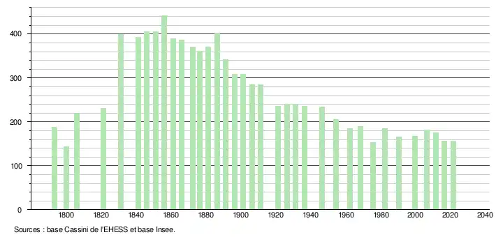 | L'évolution du nombre d'habitants est connue à travers les recensements de la population effectués dans la commune depuis 1793. Pour les communes de moins de 10 000 habitants, une enquête de recensement portant sur toute la population est réalisée tous les cinq ans, les populations légales des années intermédiaires étant quant à elles estimées par interpolation ou extrapolation[24]. Pour la commune, le premier recensement exhaustif entrant dans le cadre du nouveau dispositif a été réalisé en 2006[25]. En 2021, la commune comptait 156 habitants[Note 5], en diminution de 3,11 % par rapport à 2015 (Gers : +0,79 %, France hors Mayotte : +1,84 %). |