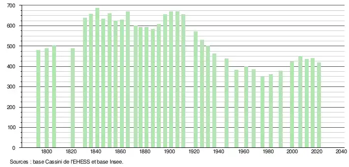 L'évolution du nombre d'habitants est connue à travers les recensements de la population effectués dans la commune depuis 1793. Pour les communes de moins de 10 000 habitants, une enquête de recensement portant sur toute la population est réalisée tous les cinq ans, les populations légales des années intermédiaires étant quant à elles estimées par interpolation ou extrapolation[24]. Pour la commune, le premier recensement exhaustif entrant dans le cadre du nouveau dispositif a été réalisé en 2006[25].
