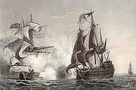 Combat entre le Real Felipe et le HMS Namur. Au premier plan, le brûlot Anne Galley, en train d'exploser après avoir été atteint par l'artillerie du Real Felipe. Toile de 1783, exposée au musée naval de Madrid.