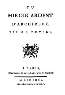 Louis Dutens, né à Tours le et mort à Londres le , est un écrivain, philologue et numismate français, historiographe du roi de Grande-Bretagne. « Grand voyageur, il a contribué à répandre ce « cosmopolitisme » qui est un des caractères essentiels de la littérature et des mœurs dans la deuxième moitié du XVIIIe siècle[1]. »