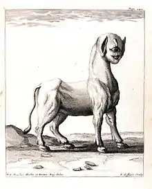Ce monstre avait onze pouces de longueur, il avait sur la tête un poil naissant, & sur le reste du corps une peau de couleur de chair lisse, marquant que ce fœtus était venu au monde avant son terme ; il avait une tête d’homme, le dessus du crane était sphérique, à la naissance de la partie supérieure du front sortait une corne mollasse, qui pendait en bas, et cachait un œil de taureau bien formé, qui était au milieu du visage, où nous avons le nez, & se terminait un peu au-dessus de la lèvre supérieure ; je ne la dessinai pourtant pas si longue, pour ne pas cacher l’œil qu’avait ce fœtus. Le front était parfaitement proportionné, il n’avait pas de nez, sa bouche était placée comme à nous, le menton de même ; les oreilles à côté de la tête étaient semblables à celles d’un cheval, de même que le col, & tout le reste du corps ne différait pas de celui d’un veau. La figure qui le représente ici, gravée sur l’original, en démontre régulièrement toute la forme extérieure. »