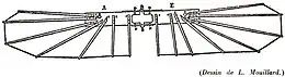 - Louis Mouillard affirme sa foi dans l'avenir du plus lourd que l'air et développe ses idées sur le « vol à la voile » ou vol sans battement. Il étudie les différentes formes d'ailes et de queues observées chez les oiseaux, il analyse le vol des oiseaux dits « rameurs » [Note 3] puis celui des oiseaux dits « voiliers »[Note 4]. Grâce à des descriptions détaillées avec mesure de leur envergure, de leur poids, de leur charge alaire, de la surface et de l'allongement de leurs ailes, il en déduit les caractéristiques que l'on doit donner à un appareil capable d'enlever un homme[10].