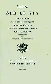 En 1863, il y a déjà quelques années que les maladies des vins français grèvent lourdement le commerce. Napoléon III demande à Pasteur, spécialiste de la fermentation et de la putréfaction, de chercher un remède : Pasteur, qui transporta deux années de suite en automne son laboratoire à Arbois, publiera les résultats de ses travaux dans Études sur le vin en 1866 (il avait publié un premier papier sur le sujet dès 1863)[129]. Il propose de chauffer le vin à 57 °C afin de tuer les germes et résout ainsi le problème de sa conservation et du transport, c'est la pasteurisation. Il a au sujet de ce procédé une querelle de priorité avec l'œnologue Alfred de Vergnette de Lamotte, dans laquelle les savants Balard et Thenard prennent parti respectivement pour Pasteur et pour Vergnette[130]. Pasteur et Vergnette avaient d'ailleurs été tous deux précédés par Nicolas Appert qui avait publié le chauffage des vins en 1831 dans son ouvrage Le livre de tous les ménages[131]. La découverte de la pasteurisation vaudra à Pasteur le Mérite Agricole, mais aussi le Grand Prix de l’Exposition universelle (1867).