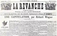Quelques semaines plus tard, Peyramont et son journal lancent une virulente campagne contre Charles Lamoureux, directeur de la Société des nouveaux concerts, qui a annoncé des représentations de Lohengrin à l'Éden-Théâtre. Dans un contexte de fortes tensions franco-allemandes suscitées par l'affaire Schnæbelé, La Revanche présente la musique de Wagner comme une provocation[26]. En raison de la violence des manifestations organisées par Peyramont, Lamoureux décide de mettre fin aux représentations et d'assigner le journaliste en justice[27]. Peu lue (avec seulement 1 200 exemplaires vendus sur un tirage de 25 000)[28], La Revanche cesse bientôt de paraître. Quatre ans plus tard, l'agitation anti-wagnérienne reprend, à l'instigation de Francis Laur, Lohengrin étant cette fois-ci à l'affiche de l'Opéra de Paris. Ne voulant pas être en reste, Peyramont rédige sept nouveaux numéros de La Revanche[26] et manifeste à l'Opéra en compagnie de Michel Morphy.