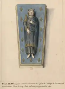 Charles IX (r. 1560-1574), qui réside à Fontainebleau, a la singulière curiosité de faire ouvrir le tombeau de Louis VII. On y trouva le corps presque en son entier ; mais les ornements royaux dont on l'avait revêtu étaient à demi consumés ; cependant on voyait encore sur la tête une couronne d'or, à ses doigts des anneaux, dans ses mains un sceptre d'or, et la grande croix en filigrane enrichie d'émeraudes qu'on avait placée sur sa poitrine.