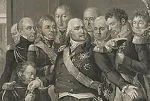 Après la défaite de Napoléon en 1814, les coalisés réunis au congrès de Vienne hésitent encore sur le successeur à choisir à Napoléon. Désireux d’installer sur le trône de France un allié, mais aussi un chef légitime, ils hésitent entre Louis XVIII, dont l’impopularité pose problème, le « roi de Rome », fils de Napoléon, mais aussi le maréchal Bernadotte ou encore Eugène de Beauharnais, et à défaut une république. Talleyrand emporte finalement l’opinion des Alliés en faveur de Louis XVIII.