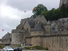 La joie de cette victoire excita dans le monastère un si vif enthousiasme, que les religieux résolurent d’engager au duché de Bretagne tout ce qu’un motif sacré leur avait fait conserver de précieux : croix, calices, chapes, mitres furent échangés contre les moyens d’ajouter de nouvelles fortifications aux remparts : des tours et des demi-lunes, avec parapets et mâchicoulis, furent élevées sur les points où l’expérience avait signalé le danger ; la porte avec herse et pont-levis fut également construite alors, ainsi que le logis qui la surmonte.