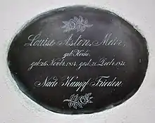 Elle est enterrée dans l'ancien cimetière de Wangen im Allgäu; sa plaque funéraire est ornée d'une épitaphe « Après le combat, la paix ». Son mari Daniel Eduard Meier, décédé en 1873, est enterré dans la même tombe. Sa tablette funéraire est également pourvue d'une épitaphe : « La mort par compassion garantit la paix et la tranquillité. L'impitoyablement traqué Meier-Aston ». "