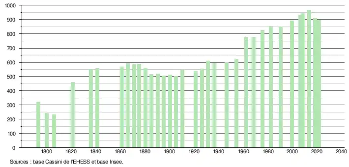 L'évolution du nombre d'habitants est connue à travers les recensements de la population effectués dans la commune depuis 1793. Pour les communes de moins de 10 000 habitants, une enquête de recensement portant sur toute la population est réalisée tous les cinq ans, les populations légales des années intermédiaires étant quant à elles estimées par interpolation ou extrapolation[25]. Pour la commune, le premier recensement exhaustif entrant dans le cadre du nouveau dispositif a été réalisé en 2008[26].