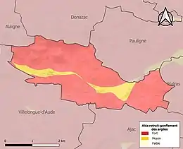 Le retrait-gonflement des sols argileux est susceptible d'engendrer des dommages importants aux bâtiments en cas d’alternance de périodes de sécheresse et de pluie. La totalité de la commune est en aléa moyen ou fort (75,2 % au niveau départemental et 48,5 % au niveau national). Sur les 149 bâtiments dénombrés sur la commune en 2019, 149 sont en aléa moyen ou fort, soit 100 %, à comparer aux 94 % au niveau départemental et 54 % au niveau national. Une cartographie de l'exposition du territoire national au retrait gonflement des sols argileux est disponible sur le site du BRGM[21],[Carte 3].