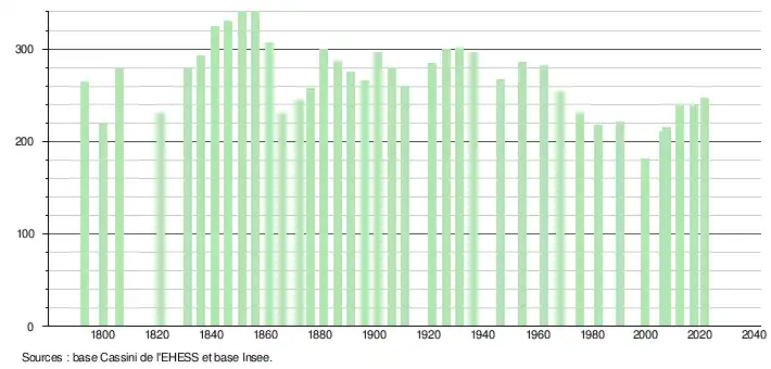 L'évolution du nombre d'habitants est connue à travers les recensements de la population effectués dans la commune depuis 1793. Pour les communes de moins de 10 000 habitants, une enquête de recensement portant sur toute la population est réalisée tous les cinq ans, les populations légales des années intermédiaires étant quant à elles estimées par interpolation ou extrapolation[22]. Pour la commune, le premier recensement exhaustif entrant dans le cadre du nouveau dispositif a été réalisé en 2007[23].