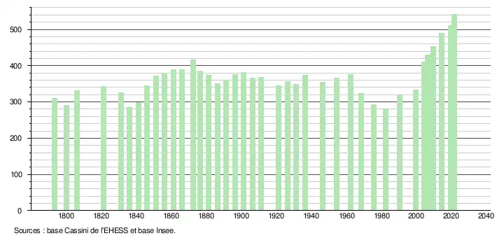 L'évolution du nombre d'habitants est connue à travers les recensements de la population effectués dans la commune depuis 1793. Pour les communes de moins de 10 000 habitants, une enquête de recensement portant sur toute la population est réalisée tous les cinq ans, les populations légales des années intermédiaires étant quant à elles estimées par interpolation ou extrapolation[22]. Pour la commune, le premier recensement exhaustif entrant dans le cadre du nouveau dispositif a été réalisé en 2004[23].