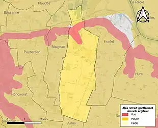 Le retrait-gonflement des sols argileux est susceptible d'engendrer des dommages importants aux bâtiments en cas d’alternance de périodes de sécheresse et de pluie. 99,9 % de la superficie communale est en aléa moyen ou fort (67,4 % au niveau départemental et 48,5 % au niveau national). Sur les 206 bâtiments dénombrés sur la commune en 2019, 204 sont en aléa moyen ou fort, soit 99 %, à comparer aux 84 % au niveau départemental et 54 % au niveau national. Une cartographie de l'exposition du territoire national au retrait gonflement des sols argileux est disponible sur le site du BRGM[19],[Carte 2].