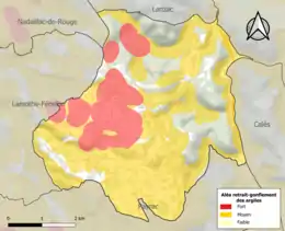Le retrait-gonflement des sols argileux est susceptible d'engendrer des dommages importants aux bâtiments en cas d’alternance de périodes de sécheresse et de pluie. 74,8 % de la superficie communale est en aléa moyen ou fort (67,7 % au niveau départemental et 48,5 % au niveau national). Sur les 203 bâtiments dénombrés sur la commune en 2019, 175 sont en aléa moyen ou fort, soit 86 %, à comparer aux 72 % au niveau départemental et 54 % au niveau national. Une cartographie de l'exposition du territoire national au retrait gonflement des sols argileux est disponible sur le site du BRGM[27],[Carte 2].