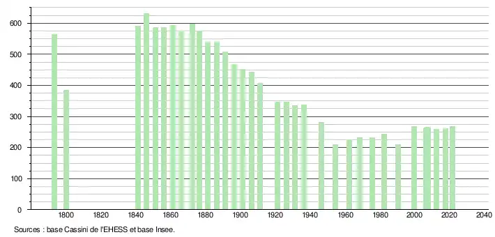 L'évolution du nombre d'habitants est connue à travers les recensements de la population effectués dans la commune depuis 1793. Pour les communes de moins de 10 000 habitants, une enquête de recensement portant sur toute la population est réalisée tous les cinq ans, les populations légales des années intermédiaires étant quant à elles estimées par interpolation ou extrapolation[35]. Pour la commune, le premier recensement exhaustif entrant dans le cadre du nouveau dispositif a été réalisé en 2007[36].